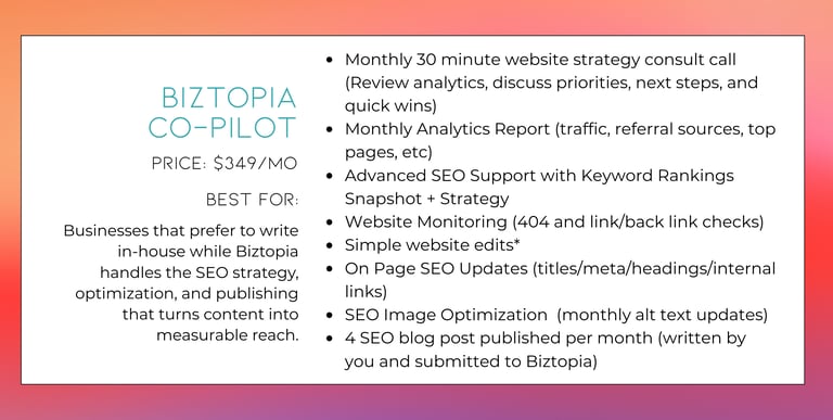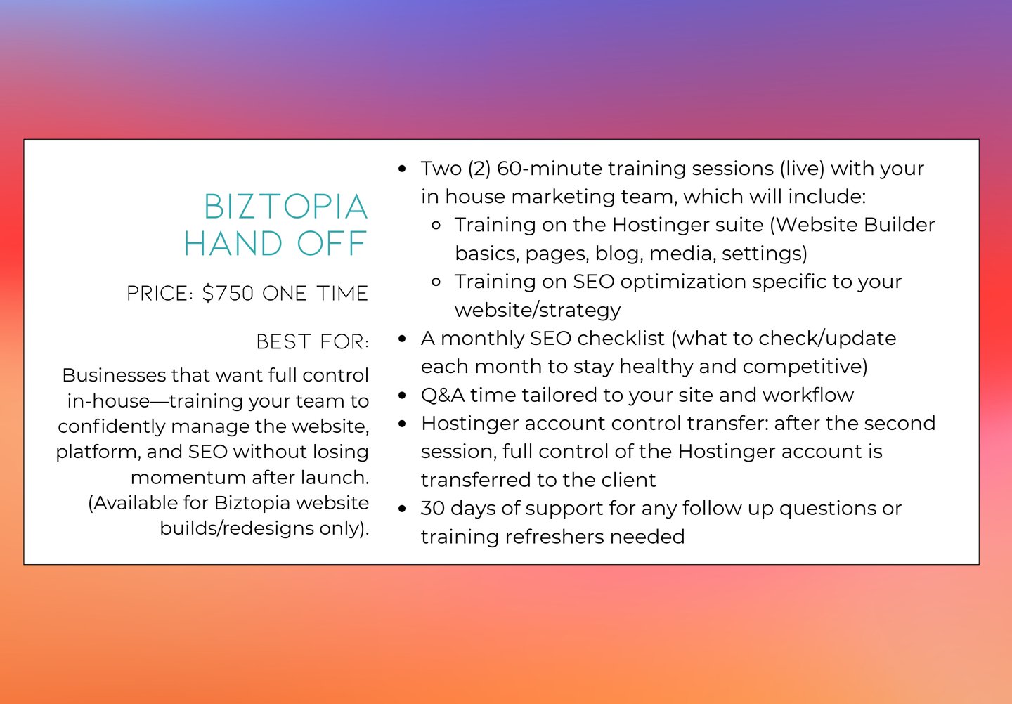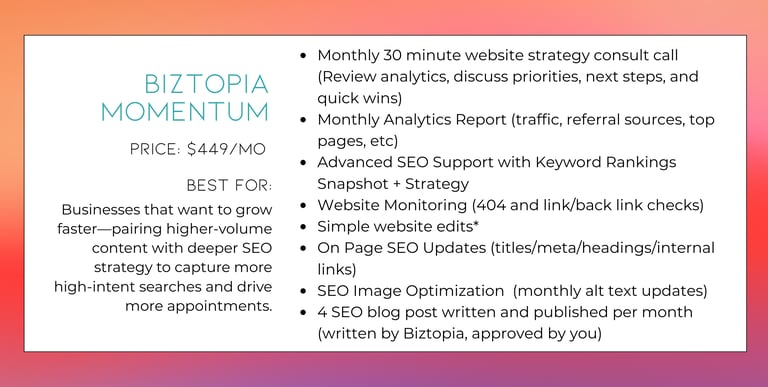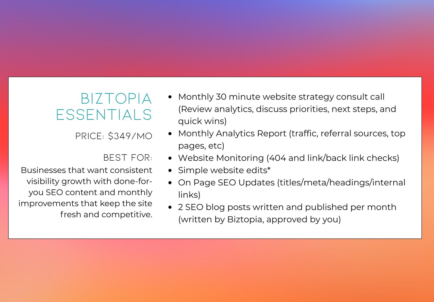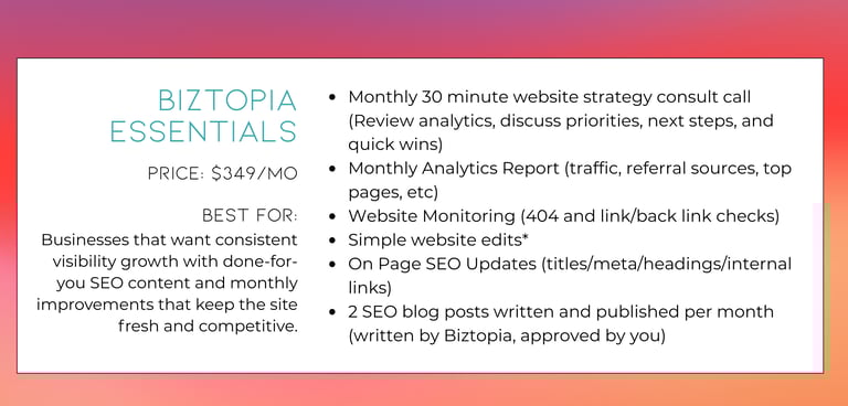 *Simple website edits is an available service if Biztopia can access your website hosting platform (or if Biztopia built your website). Simple website edits include swapping images, revising minimal verbiage, changing contact info, updating form links, etc. Larger changes may incur additional fees.