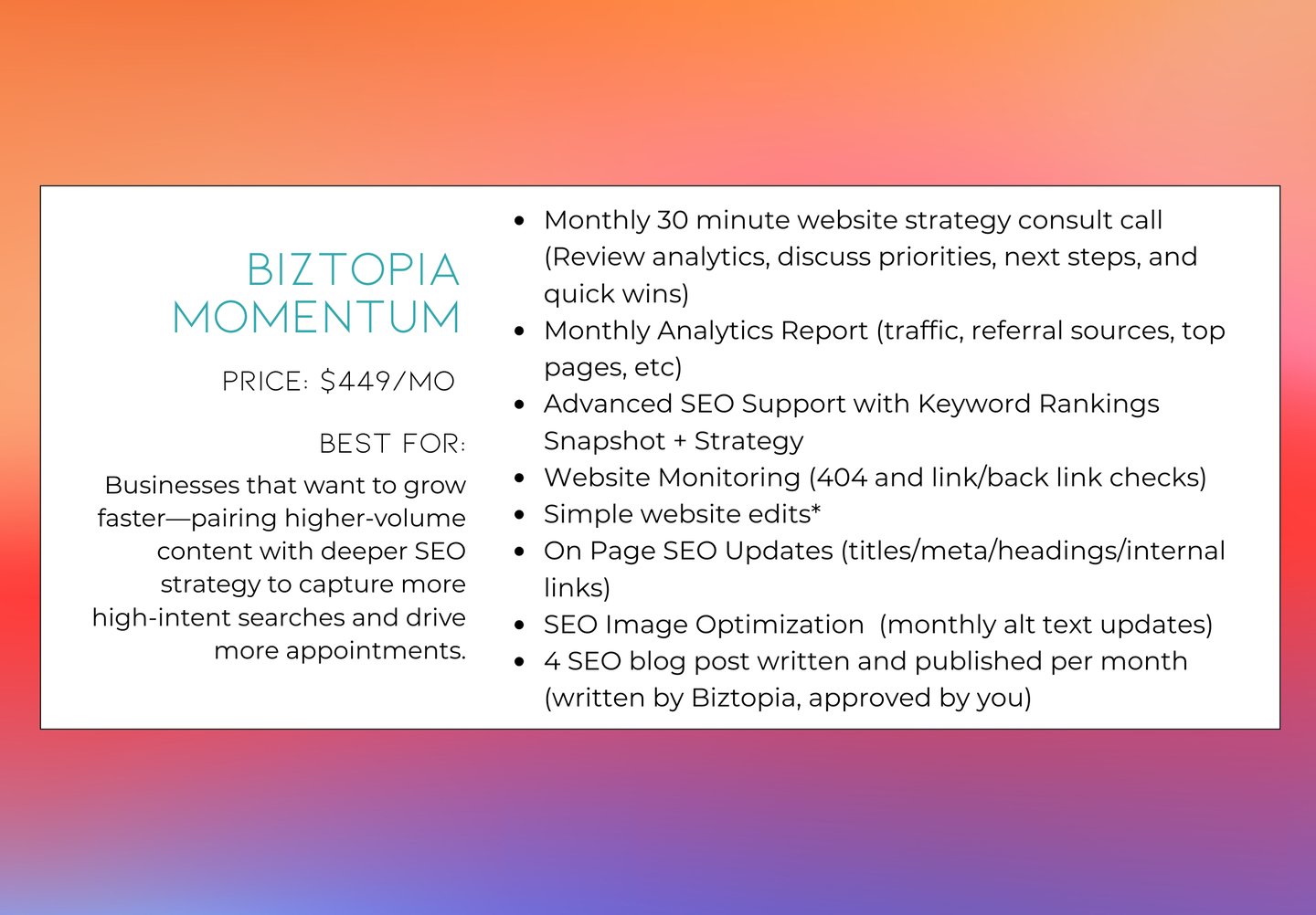 Biztopia’s Website Hosting and SEO packages are designed to turn your website into a steady source of new business—not just a digital brochure. With ongoing SEO-focused updates, strategic content, and clear monthly priorities, you’ll expand your reach in search results, show up for more high-intent local queries, and build lasting momentum. All packages are month-to-month (no long-term contracts), so you stay in control and risk stays low.