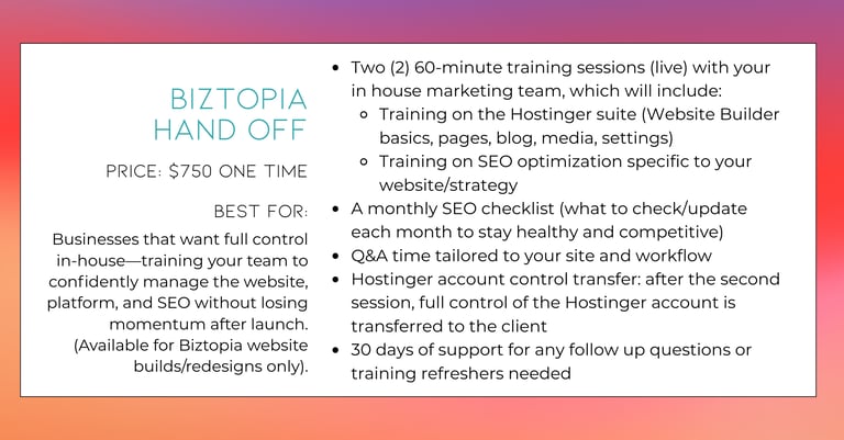 While the initial investment may seem higher than DIY or instant website options, Biztopia delivers expert strategy, hands-on design, and personalized SEO support—plus 4 years of free web platform hosting, which can save you hundreds or even thousands depending on your previous platform hosting costs. Agencies often charge $6,000–$20,000+ for similar quality and service-we just don't feel right charging that much.